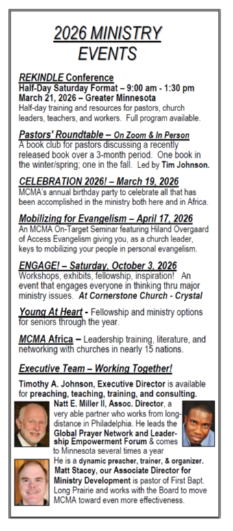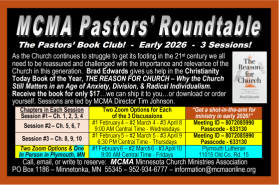 MCMA's Pastors' Roundtable is a book club that reads two books each year and this Early 2026 season we will be reading together Brad Edwards' THE REASON FOR CHURCH: Why the Church Still Matters in an Age of Anxiety, Division, & Radical Individualism. This book, cited as Christianity Today's Book of the Year 2025, gives all of us committed to the church renewed confidence that the work we are doing is vitally important in this challenging season. You may download the book, purchase it online or have us send it to you. Cost: $17.